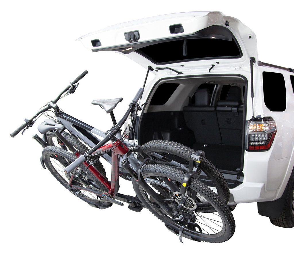 El diseño elegante, compacto y liviano transporta dos bicicletas en una sola barra