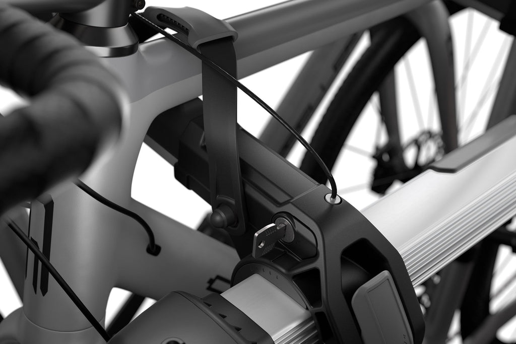 Fija las bicicletas al portabicicletas y el portabicicletas al auto (se incluyen las trabas)
