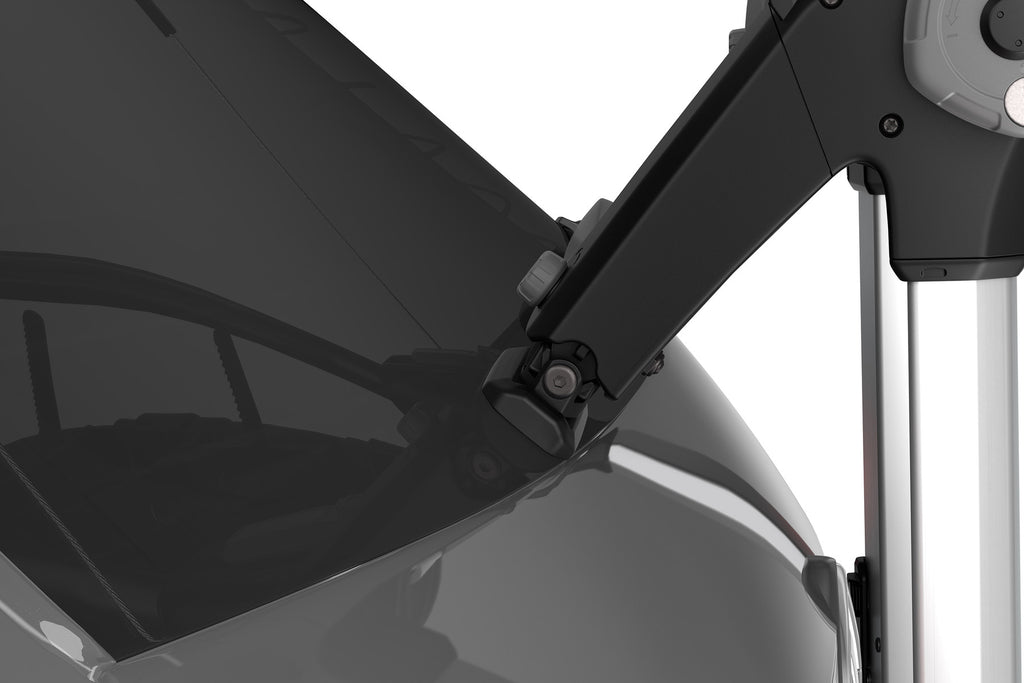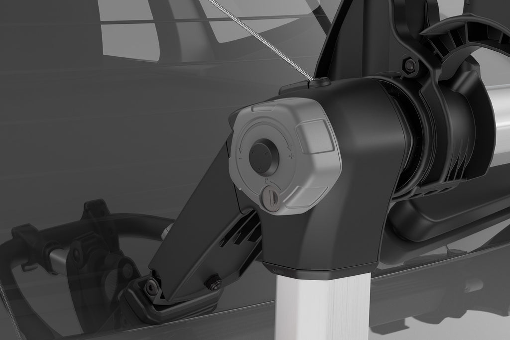 Fácil montaje de bicicletas con brazos de bicicleta ajustables/removíbles y perillas de limitación de torque Thule AcuTight que hace un clic cuando se alcanza el torque óptimo